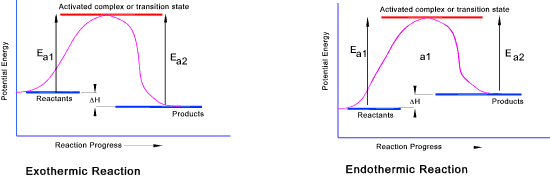 The reactants are shown on the left of the equation and the products are shown on the right. The number of atoms of each element will therefore be the same on both sides of the equation. A reaction can be exothermic (exoergic) or endothermic (endoergic) or for very rare cases athermic (aergic).