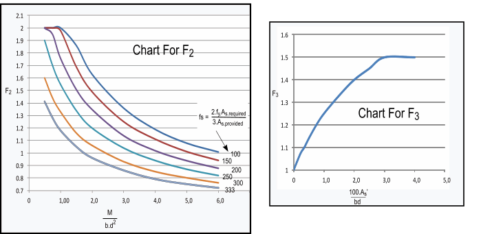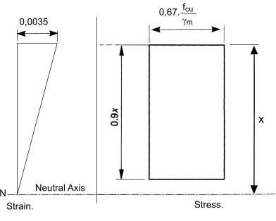 In the notes below the characteristic strength for concrete ( f cu ) is the value of the cube strength and the characteristic strength for the reinforcement ( f y ) is the designated proof/yield strength. The referenced standard for these notes (BS 8110) also identifies a partial factor of safety γ m which is applied to these strengths to take into account the difference between test and practical conditions. It should be noted that the strength of concrete related to flexure is actually accepted as 0,67. f cu.