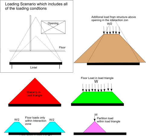 3) Half of any point or distributed load applied to the masonry within the zone of interaction is carried by the lintel