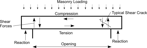 1) The weight of the masonry in the loaded triangle as shown above is carried by the lintel.