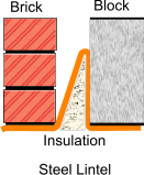 Profiled galvanised steel or stainless steel are very useful for cavity wall construction because they can be formed to support both leaves and also incorporate insulation in the section. Detailed information on steel lintels is found in the links at the foot of this page. There are numerous steel lintel profiles for solid and cavity walls..A typical cavity wall lintel with provision for insulation is shown below