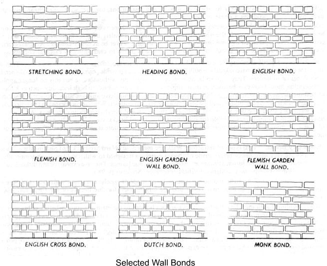 The bonding of bricks is important to its performance as a structural material. Various bonds exist, some more attractive than others. while some special bonds related to reinforced brick work. Cavity walls employ stretching bonds where each skin of the wall is laid a half brick thick and the only headers shown are at reveals and quoins (corners). Other bonds show both headers and stretcher faces.
