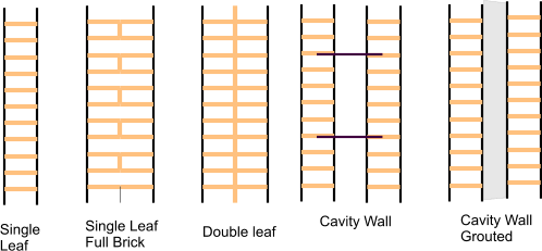 | Cavity wall- defined as a wall constructed of two parallel single-leaf walls, tied together with wall ties or bed joint reinforcement. One or both leaves can be load-bearing. The cavity between the leaves can be filled, or partially-filled, with non-load bearing insulation material |