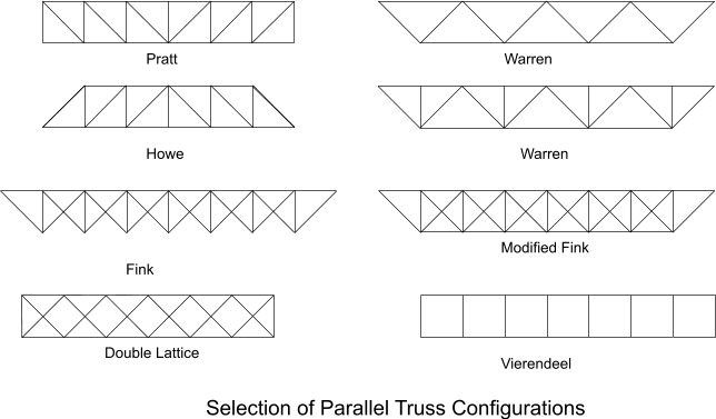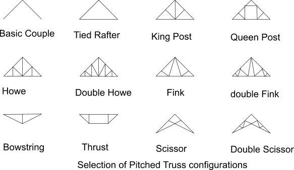Frames definition A frame is part of, or all of a structure , comprising of an assembly of directly connected structural elements, designed to act together to resist load. This relates to moment resisting frames and triangulated frames and covers both plane frames and three-dimensional frames. Frames types Trusses A truss is a structure comprising one or more triangular units constructed with straight members whose ends are connected at joints referred to as nodes. External forces and reactions to those forces are considered to act only at the nodes and result in forces in the members which are either tensile (in a tie member) or compressive forces (In a strut member. All of the nodes in a truss are assumed to be pin joints which do not transmit moments. Trusses are easily separated into two groups : pitched trusses as used for building roofs and parallel trusses which are often used for spanning e.g bridges. The figures below illustrate ,very crudely, a selection of truss designs. These are shown as planar constructions . The designs are also relevant to 3 D constructions " Space Frames". Selection of Pitched Trusses
