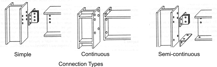 Connection types Connections between structural elements is one of the most important areas of design structural steelwork. There are three principle types of connection . 1) Simple connections transmit negligible bending moments across the joint . This joint allow the beams to rotate relative to each other . They are effectively pin joints.