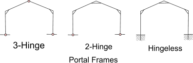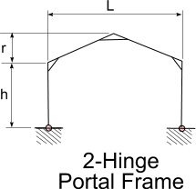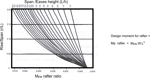 The forces involved in three hinged portal frame can generally be easily resolved using statics. The problem is then broken down to determination of the shear forces and the bending moments for the two individual beams making up the portal frame. Two hinged and hingeless portal frames are classified as statically indeterminate structures and conditions other than statics conditions have to be used to calculate the end reactions and moments. Consider a two hinge portal frame as shown below. Plastic hinges are formed in the eaves and near the apex. A very preliminary method of estimating the horizontal base loads and the design moments in the rafters and stanchions involves using the graphs as shown below.