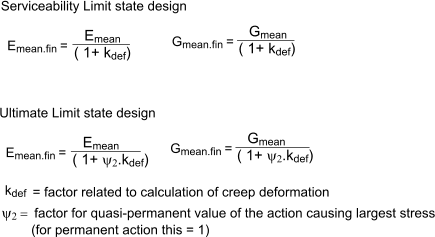 Eurocode 5 includes consideration for the load duration and moisture influences on deformations having time-dependent properties i.e creep. The final mean modulus of elasticity and shear modulus used to calculate deflections are obtained using the following equations.