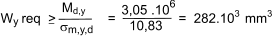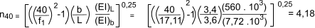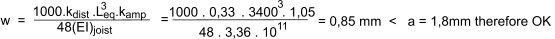 Final deflection due to permanent actions reference... Deflections ufin,G = uinst,G ( 1+ kdef) = 1,13 *1,8 = 2,034mm Final deflection due to variable actions reference ...Deflections, reference Factor values ufin,Q = uinst,Q ( 1+ ψ2 . kdef) = 6.87 * (1 + (0,3.),8) = 8,51mm Checking the final deflection ufin = ufin,G + ufin,Q Vibration Assuming that f1 > 8 Hz it is necessary to check that W/F ≤ a and ν b(f1.ζ -1 ) kstrut = 1,0 Hence kdist = Hence kdist = kstrut[0,38 -0,08 ln[14(EI)b/s4 ] ≥ 0,30 Therefore the maximum deflection caused by a concentrated static force F = 1,0, w, is