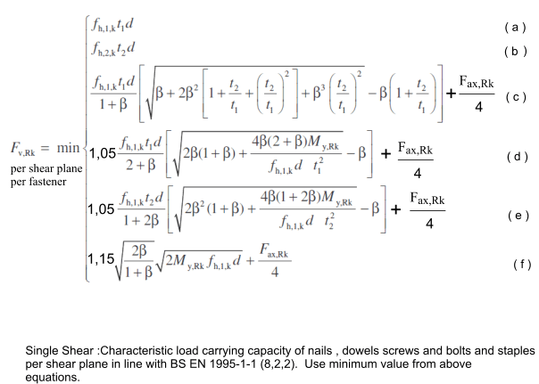 Single Shear :Characteristic load carrying capacity of nails , dowels screws and bolts and staples per shear plane in line with BS EN 1995-1-1 (8,2,2). Use minimum value from above equations.