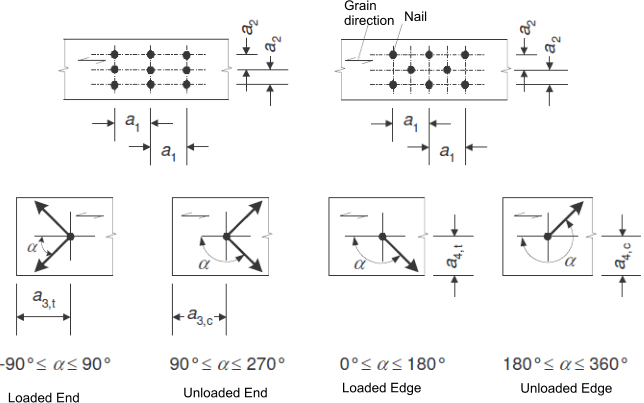 Nails Laterally loaded nails. A nail is either smooth or grooved. The embedment strength, connection strength and spacing / distance requirements for nails are shown in the sections above. Characteristic Embedment strengths..... Edge and distance spacing..... Timber at risk of splitting should be predrilled for nails when As an alternative to this rule the edge distances above may be adjusted such that for ρk <= 420kg/m3 then a4 > = 10 d and for 420kg/m3 <= ρk <= 500 kg/m3 then a4 >= 14d. For one row of nails in a row parallel to the grain ,the load carrying capacity parallel to the grain is