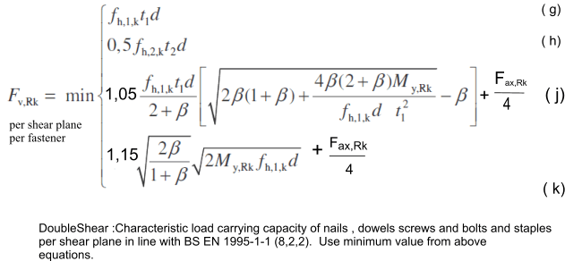 DoubleShear :Characteristic load carrying capacity of nails , dowels screws and bolts and staples per shear plane in line with BS EN 1995-1-1 (8,2,2). Use minimum value from above equations.