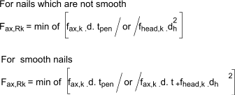 Axially Loaded Nails Only nails which are classified as threaded should be used for withstanding axial loads. A threaded nail has its shank profiled or deformed over a minimum of 4,5d and has a characteristic withdrawel parameter fax,k greater than or equal to 6 N/mm2 when measure in timber with a characteristic density of 350 kg/m3 at 20degC and 65% humidity Only the threaded part of the nail is considered capable of transmittting axial loads. The characteristic withdrawel capacity of nails Fax,Rk for nails driven in perpendicular to grains should be taken as the smaller values from the equations below