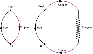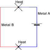 When two wires of different materials are joined together to make a complete circuit and one of the junctions is heated then a current will flow as shown. This effect is called the Seebeck effect after the discoverer Thomas Seebeck...