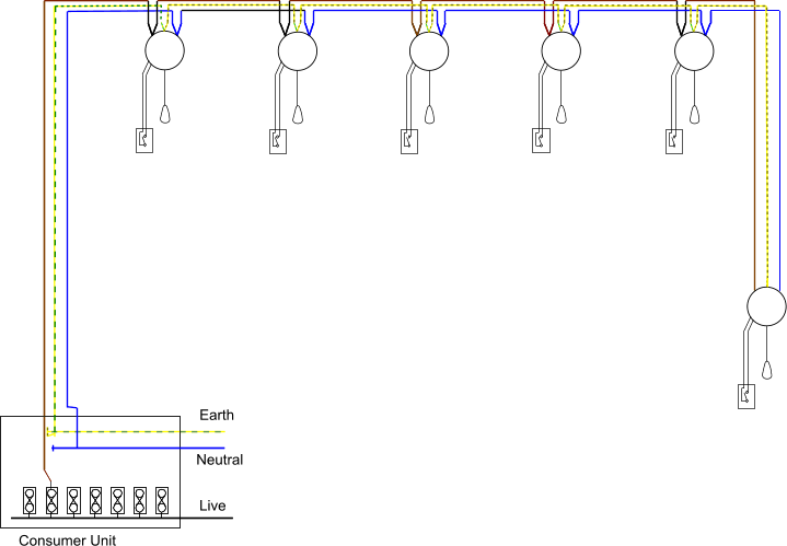 Below is shown a basic lighting circuit for a UK house. The circuit is provided with a 5 A fuse/MCB at the consumer unit. Generally one lighting circuit is require for each floor of a typical house.
