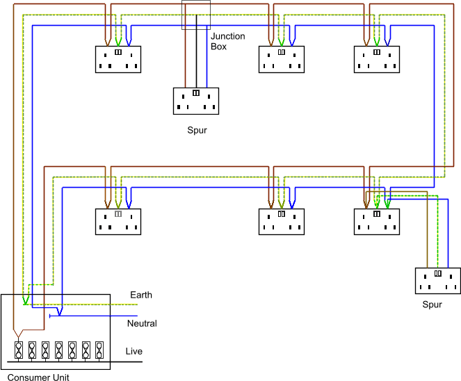 Below is shown a basic ring circuit for a UK House . The circuit is provided with a 32 A fuse /MCB in the consumer unit. There is generally a separate ring circuit for upstairs, downstairs and the kitchen. The circuit shown includes two spurs one from a junction box and one from a plug. socket.