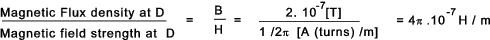 Consider a single conductor A carrying a current of 1 Ampere as shown with only the effects of the current flow down being considered (the return flow path being some distance away). The magnetic field strength at a radius of 1 m is 1 ampere(turn) and the length of the field is 2π.metres. The magnetic field strength at 1m is therefore 1/(2.π) amperes(turns) per metre.