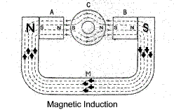 Magnetic Induction If a soft iron block is located within a magnetic field the lines of flux will pass through the iron block and it will become a temporary magnet. The iron block is magnetised as a result of magnetic induction. The figure below shows a U shaped permanent magnet with two soft iron blocks (A & B) attached to the magnet and a cylinderical block C located between A & B. No lines of magnetic flux pass through the hole in the cylinderical block and any object placed in this hole would be screened from the magnetic field.