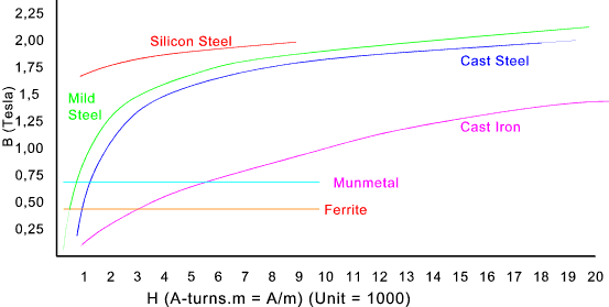 The ratio B/H for a vacuum is called the permeability of free space and is given the symbol μo with units henry per metres and is virtually the same for a vacuum , air , and other non-magnetic materials such as wood, oil, copper etc μ = B/H μr for non magnetic materials is generally about 1. For ferromagnetic materials iron, steel etc μr varies significantly as H increases. To illustrate this point ref to figure below showing a very very approximate B/H curves for different ferromagnetic materials.