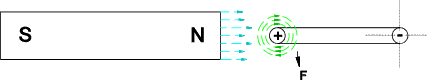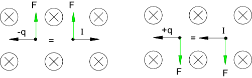 The definition of flux density (Flux Density) is such that the force on a conductor of length l in a magnetic field of flux density B webers when the current flow in the conductor is I amperes is F (newtons) = I.l.B Electromagnetic Induction In 1831 Michael Faraday discovered that if a conductor moves relative to a field of magnetic flux a current flow is induced in the conductor. The magnitude of the induced current is related to the strength of the magnetic field and to the velocity of relative motion. Consider a negative charge (-q )moving towards the left in a downward direction magnetic field which is equivalent to a current ( I )in the opposite direction . Both experience a force as shown in the figure below. In the same way a positive charge (+q ) moving to the left which is equivalent to a current I moving in the same direction will experience a force in the opposite direction.