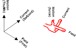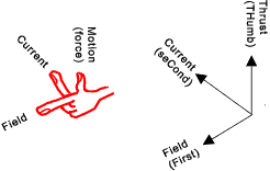The force on a conductor in a magnetic field is related to the current and is also related to the strength of the magnetic field. Flemings Left Hand Rule. This is used to identify the relative directions of the field, current and motion (Thrust) when a current flows in a conductor in a magnetic field........