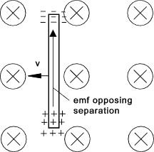 Now consider a conductor moving towards the left at a velocity of v. The electrons will experience a force F tending to move them up leaving positive ions at the other end of the conductor. This movement will continue until the force F moving the charges is balanced by the resulting e.m.f opposing the motion.. ref, Def. Flux Density