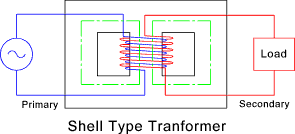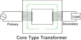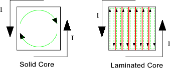 When the secondary winding is in open circuit its terminal voltage is the same as the induced e.m.f . The primary current is such that the induced e.m.f is equal and opposite to the applied alternating voltage. When a load is connected to the secondary winding a current flows. This secondary current induces a magnetic flux which tends to reduce the current flow (Lenz's Law). The induced flux tends to reduce the magnetic flux and the resulting back back e.m.f.in the primary windigs This changes the difference between the applied voltage and the back e.m.f.in the primary windings from (say 0,05% to 1%). As a result the primary current increases, by say 20 times the no-load current. The demagnetising ampere turns of the secondary winding are thus neutralised by the increase in the primary ampere turns.. As the initial no-load primary ampere-turns are very small it can be stated that Full load Ampere-Turns on (Primary) = Full load Ampere-Turns on (Secondary) In practice the above are all approximate Transformer LossesThe energy wasted in a transformer can be divided into magnetic leakage losses copper losses and iron losses. The iron losses are hysteresis losses and eddy current losses. The hysterisis losses are described on webpage Electromagnetism - Hysteresis Losses.
