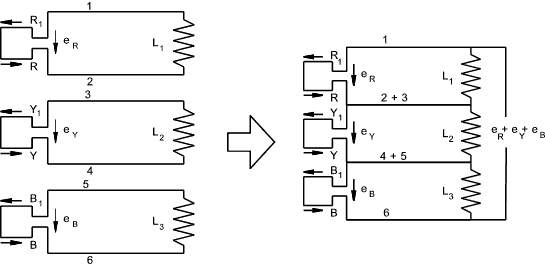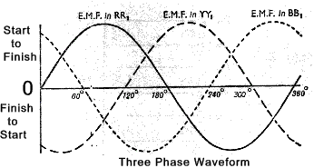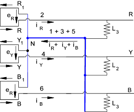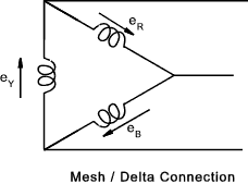 This system results in six conductors and can be simplified to reduce the number of conductors. Initially it is possible to replace conductors 2 and 3 with one conductor and conductors 4 and 5 with one conductor. It can also easily be proved that there is no voltage difference between 6 and 1 allowing these also to be connected as one conductor and any stage in the cycle, as follows e R + e Y + e B = E m [sin ( θ ) + sin ( θ -1200 ) + sin ( θ -2400 ) ] This method of connecting the conductors in a three-phase system is called a Mesh or Delta connection and is generally shown as below