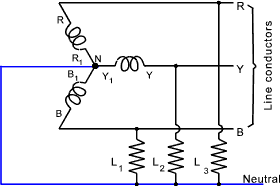 Star Connection of Three Phase supplies If the three start conductors 1,3,and 5 connected as one conductor NM as shown (in blue) below then the current flow is as shown...Three phase motors can be connected to the line conductors R.Y and B while lights, heaters etc are usually connected between the line conductors and the neutral line as shown by (L 1,L 2 & L 3 )