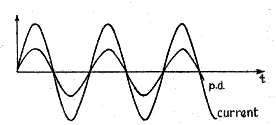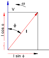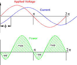 It is clear that if the phase difference is +/- (π /2) a purely capacitive or inductive load then the power from the alternator = 0. Power in watts = Voltamperes .power factor = V.I.cos φ For an alternative view on the topic consider an alternating voltage V with a current lagging by φ shown vectorially below..