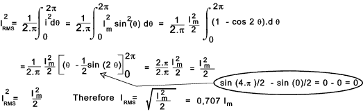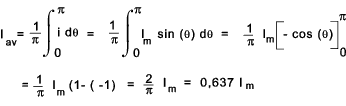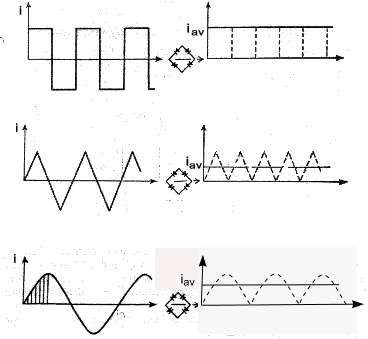 For the square wave pattern the average value of the full wave rectified form is i av = I m In practical electrical engineering the average value is of little importance. It is most important to consider the work that the electricity can do either in heating or in mechanical work. This is generally related to the power equivalent of the current W = I2 /R or V2 /R Consider one cycle of the square waveform as shown below. (two cycles actually shown)