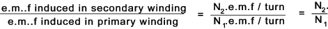 An alternating voltage applied to the primary coil results in an alternating current which produces an alternating magnetic flux in the metal core. The current /flux level is just sufficient to induce an e.m.f that is practically equal and opposite to the applied voltage. The mean path of the alternating flux is indicated in the figure. Assuming all of the flux passes through the primary and the secondary winding,it induces the same e.m.f. in each turn of both coils. Hence if N1 and N2 are the number of turns in the primary and secondary coils respectively .