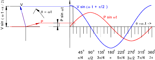 The rotating vector on the left is assumed to be rotating at a constant angular velocity ω Two sinusoidal alternating variables with different amplitudes and phases are shown together as below.