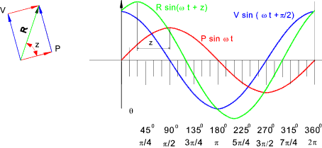 The two vectors can be added as shown below to obtain a resultant vector R.sin (ω t + z).