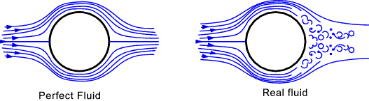 A perfect fluid flowing past an infinitely long cylinder is represented as streamlines which are arranged such that the flow through each streamline is fixed at Q . The streamlines flow over the cylinder and all forces are balanced front/back and top /bottom and there is therefore no form drag. A perfect fluid cannot transfer shear stress so there is no viscous drag. In real fluids there is a pressure build up on the front surface as the fluid is slowed and the streamlines are re directed round the cylinder. As the fluid flows over the cylinder the fluid separates into a wake which is a lower pressure region. There is therefore significant form drag. There is also skin-friction drag as the fluid passes over the surface.