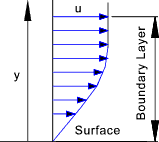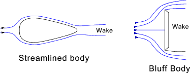 Boundary Layer and Wake Flow past a slender body or flat plate arranged parallel to the flow results in a flow regime as shown below. The flows at the surface are brought to rest relative to the surface and flows close to the surface are slowed. This effect reduces rapidly as the distance from the surface increases until the flow is completely unaffected. The flow pattern may be split into two regions: A thin boundary layer in which friction (viscous) drag forces are important and a region in which bernoulli's equation primarily applies i.e. the total head is constant.