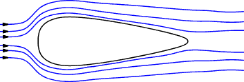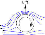 If the cylinder rotates, as shown below, the drag between the surface and the fluid results in the fluid flow as shown. The flow results in higher fluid velocities above the cylinder compared with the flow below the cylinder . Application of bernoulli's equation results a lower pressure above the cylinder and a consequent lift.