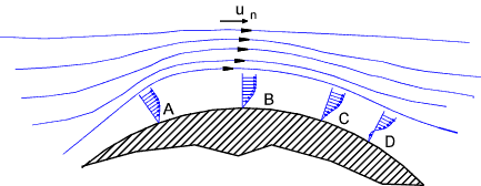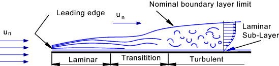 The boundary layer as formed by a fluid flowing along one side of the flat plate is initially laminar, as shown below. The velocity gradients are primarily due to the viscous drag near the surface of the plate. The velocity upstream of the plate and in the region outside the boundary layer is u n .