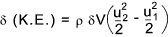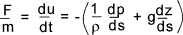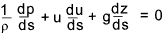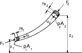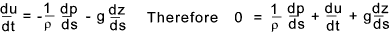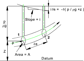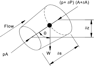Upstream the pressure is p and downstream the pressure is (p + δp). δp may be negative. The forces at the side of the element vary but it will be assumed that the mean pressure is (p +kδp ) with k being some value less than one. Taking forces in the direction of flow and noting that the hydrostatic forces on the sides mean = (p +kδp ) are acting on the area δA - all other side forces are perpendicular to the axis and are ignored. The weight of the element = ρgAδs Resultant Force = pA - (p + δp)(A+ δA ) + (p + kδp)δA - ρgAδs cos θ ignoring second order of small quantities... Resultant Force = Aδp - ρgAδs cos θ The mass of the element is constant and therefore the resultant force must be equal to the mass times acceleration of the element in the direction of the force du/dt . ρAδs (du/dt) = Aδp - ρgAδs cos θ Now ( δs cos θ) = δz where z represents height above a horizonatal datum level.