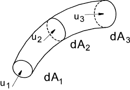The local velocity u is assumed to be normal to the local cross section and the density and velocity are constant over the entire local section then. uρA = Constant For fluids of constant density (incompressible fluids -liquids) with average flow u this reduces to uA = Constant = Q That is, under the conditions specified, when the area increases the velocity reduces and vice versa Bernoulli's Equation..Perfect Fluids The equation is an expression of the conservation of energy. Initially the only forces considered are gravity, pressure and inertial forces. The viscosity forces are assumed to be neglible. The fluid is assumed to be a perfect inviscid fluid under steady flow conditions. Newtons First law ...Every body continues in a state of rest or of uniform rectilinear motion unless acted upon by a force The relationships between the changes can be analysed using Newtons second law.. Newtons Second law ...The time rate of change of linear momentum of a body is proportional to the unbalanced force acting on the body and occurs in the direction in which the force acts. i.e Force = Mass.Acceleration. Applying Newtons first law to a small element of fluid within a single streamline of small cross section as shown below. The ends of the streamline are assumed normal to the centre line of the streamline . Considering the forces of pressure and gravity around the element and ignoring all other forces (viscosity , surface tension, magnetism, nuclear etc).
