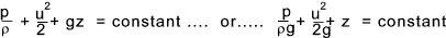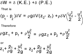 The resulting equation (in both forms) is known as Bernouli's equation and is probably the most widely used in fluids and hydraulics and explains many of the phenomena encountered in these areas of engineering. In the second form each term has the energy per unit weight ρg and has units [ML2 /T2] / [ML /T2] = [L]. The terms are identified as pressure head, velocity head, and gravity head.