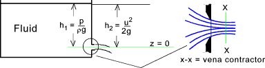 The figure below illustrates the condition of a perfect fluid flowing out of reservoir through a sharp edged orifice. The fluid flows out as a free jet. The datum z is assumed to be at the centre line of the orifice.