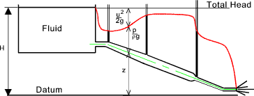 The figure below shows a hypothetical fluid system taking no account of friction losses in the pipe line. The gauge points show the pressure head at the connection point. The differences in level between the gauge level (red line) and the tank level represents the kinetic head.
