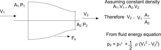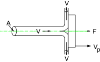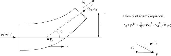 Introduction The study of forces resulting from the impact of fluid jets and when fluids are diverted round pipe bends involves the application of newtons second law in the form of F = m.a. The forces are determined by calculating the change of momentum of the flowing fluids. In nature these forces manifest themselves in the form of wind forces, and the impact forces of the sea on the harbour walls. The operation of hydro-kinetic machines such as turbines depends on forces developed through changing the momentum of flowing fluids. I have created a excelcalcs spreadsheet for convenient access to all of the equations found on this page . This is located at ExcelCalcs.com calculation Fluid Jets Symbols
