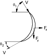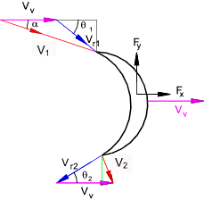 In the x Direction: u 1x = V cos θ 1 , u 2x = -V cos θ 2 Force on Moving Vane. The notes below related to vanes as used in impulse turbines. These turbines derive the mechanical energy mainly from the change in momentum as the fluid passes through the vanes. The conditions as shown when the vectorial sum of V v + V r1 = V1 results in smooth entry with efficient transfer of energy of the fluid to the vane. When this does not occur there will be turbulent flow over the vane with significant losses.