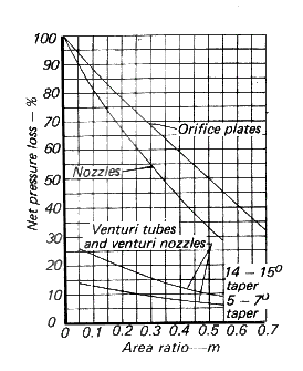 Flow Conditioning The accuracy of the flow measuring devices is very much affected by uniformity of the approaching fluid flow. Therefore ideally there should be a straight length of piping before the flow measuring device. It is generally accepted that for accurate flow readings there should be 50 pipe diameters of straight piping before the metering device following any pipe bend, valve, tee, reducer etc. The relevant standard provides a range of recommended minimum straight lengths depending on the nearest upstream fittings varying from 5 to 44 lengths. This length can be reduced if flow straighteners or flow conditioning devices systems are used upstream of the flow measuring device. A flow straightener is designed to remove swirl from the flowing fluid. A flow conditioner is a device which removes swirl and also redistributes the velocity profile to produce near ideal metering conditions. Losses resulting from flow metering devices The orifice plate and, to a lesser extent the nozzle has significant kinetic energy losses downstream of the metering device as the locally generated kinetic energy is dissipated. The figure below illustrates the extent of these losses.