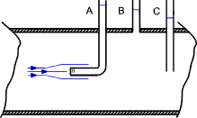 Now the static head of the fluid (p /ρg ), that is the height that the fluid rises in the tube with the fluid velocity at zero, is indicated by the tube at position B. At the interface of a flowing liquid with a solid surface the fluid velocity is zero. The head at position A is a measure of the stagnation head (p /ρg +u 2 /2g) Reference ..Stagnation point.