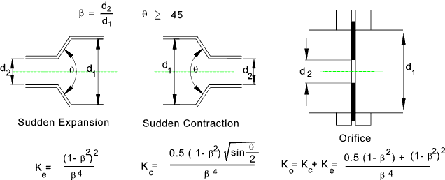 K values for Sudden Expansion-Contraction & Orifice The losses through these fitting are generally evaluated by first obtaining β = d2 / d1