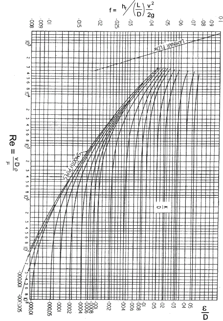 K p = f (L/D) for the length of pipe. ( this may be made up of ∑ f(L/D). for a number of different pipe lengths of different diameters ) A Moody chart (see below) is used to determine the turbulent flow friction factor from the Reynolds number and the relative roughness of the pipe. If the flow is laminar then the fricton factor is 64/Re. Note: it is suggested that for laminar flow in pipe at Re number approaching 2000 the above K values are used for bends and fitting with reasonable accuracy A moody chart and tables for roughness values and (L/D) factors for various fittings are provided below Moody Chart