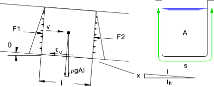 In an open channel, the flowing water has a free surface and flows by the action of gravity. See figure below. The water flows with a velocity v down a channel with an incline θ. The water depth is uniform and therefore the downward force F1 is balanced by the upward force F2. The only force causing motion is the weight component in the direction of motion ρgAl sin θ.