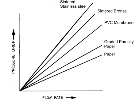 Filters Filters are an important part of hydraulic systems. Metal particles are continually produced by mechanical components and need to be removed along with other contaminants. The current convention is to provide the following filters in a hydraulic system. 1)The reservoir will be sealed and provided with a filler cap with an air filter included to minimise contamination of the fluid from the environment. It is also good practice to circulate the oil continuosly for a period of time, with the components with very small gaps being out of circuit. When the oil has been suitably cleaned the filters elements are replaced and the sensitive components are introduced into the circuit. There are many types of filter in use including felt, woven wire, impregnated paper. and sintered metal. Those which are capable of being easily cleaned are usually above 25 μm are used as suction filters. the most popular throw away filters are impregenated paper filters which are supplied in ranges < 2 to 40 μm.. these are used in suction returen and also high pressure filters. The allowable flow through a filter element depends on the permeability of the oil and the area of the exposed media to the oil flow. A crude measure of the permeability is shown on the graph below.